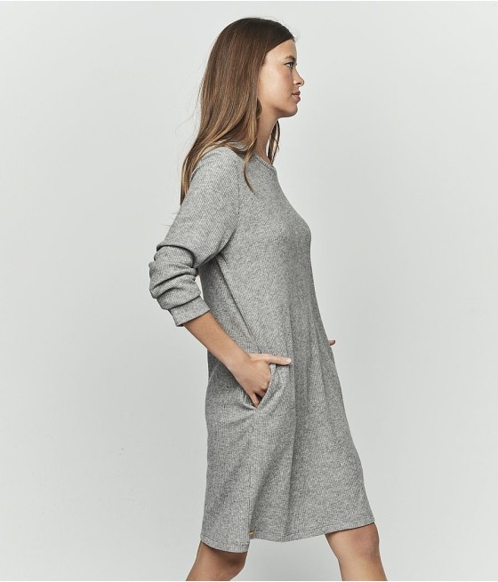 Bata corta en tejido suave coralina color gris, combinado con rosa claro. Con bolsillos tipo canguro. Cierre con cremallera.