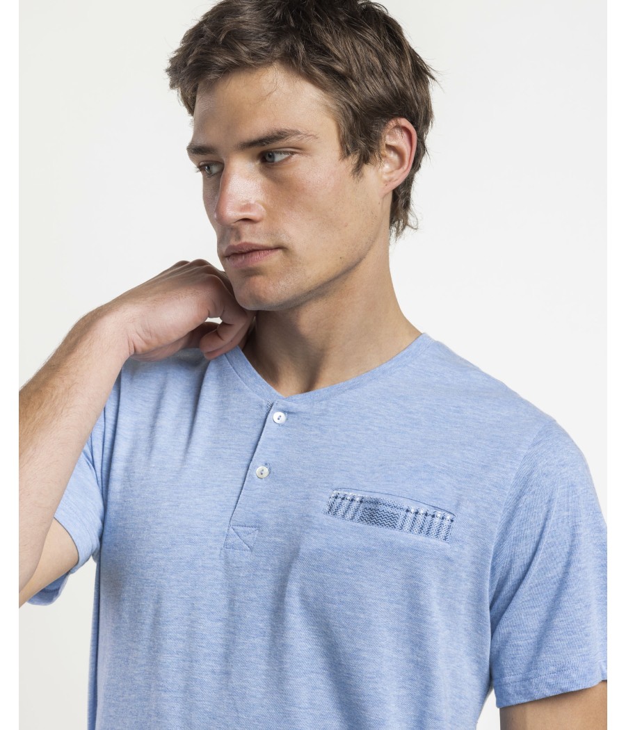 Camiseta de punto vigoré en azul jaspe con bolsillo en el pecho, cuello redondo abierto botones y bies decorado cuadros.