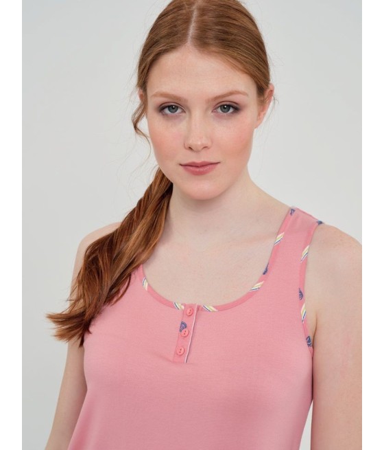 Camiseta sin mangas en punto color rojo coral, cuello redondo con detalles estampados.